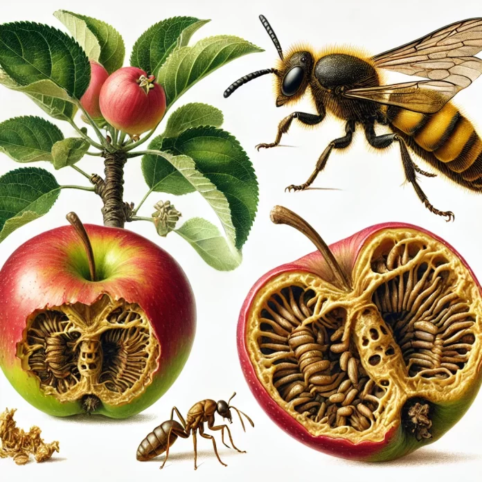 The apple sawfly (Hoplocampa testudinea) is a small, wasp-like insect that primarily affects apple (Malus domestica) trees. It is a significant pest in orchards, causing damage to developing fruit by burrowing into them, leading to premature fruit drop and reduced yields. The larvae feed within the fruit, creating characteristic tunneling damage known as “sawfly trails.”