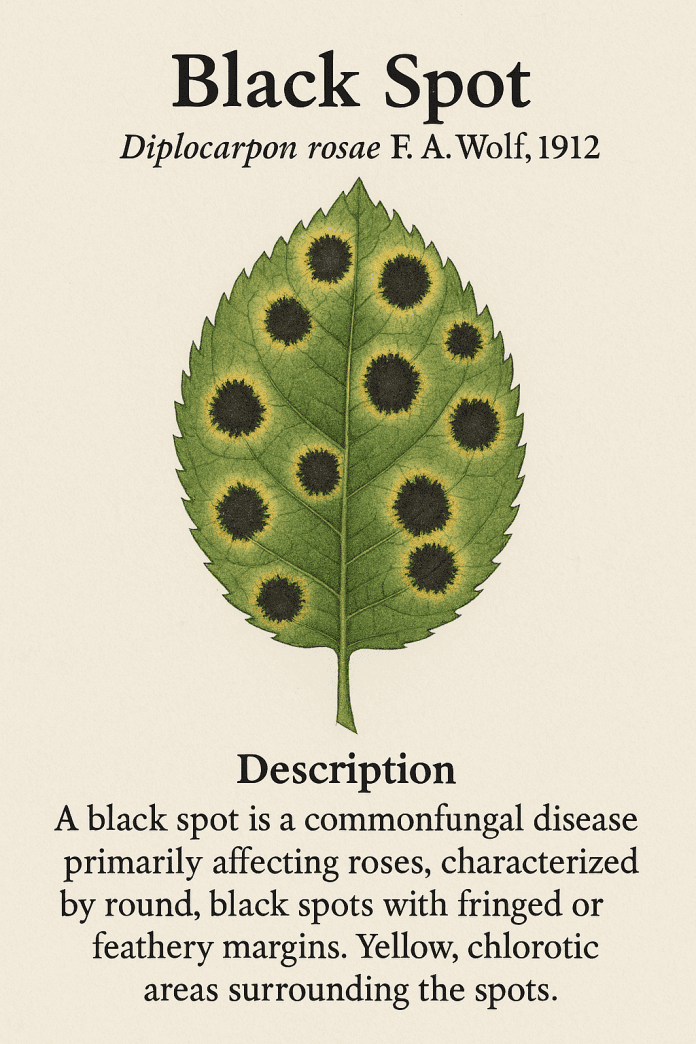 Black spot is a fungal disease that primarily affects roses (Rosa spp.), though it can also impact other ornamental plants. It is one of the most common and destructive foliar diseases of roses, leading to defoliation, weakened plants, and reduced flowering. The disease thrives in warm, humid conditions, spreading rapidly in wet weather.