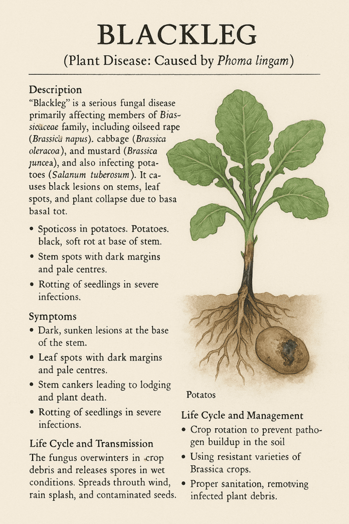 Blackleg is a destructive disease that can severely impact Brassica and potato yields. Integrated disease management, combining cultural practices, resistant varieties, and targeted control measures, is essential for effective prevention and mitigation.