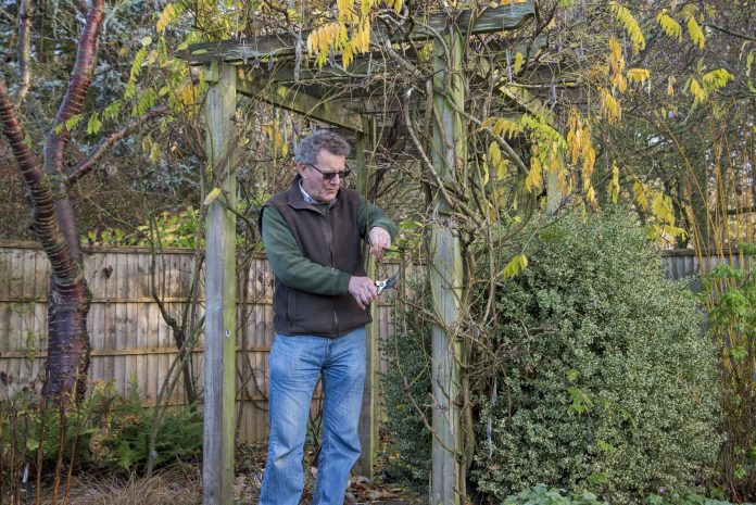 Now that the leaves have turned yellow and started dropping off, it’s the perfect time to prune Wisteria. This year, for a variety of reasons, the team didn’t prune their shoots back to 6 buds. Therefore, they are going for a single prune this winter and cutting back to three buds from the previous year’s growth.