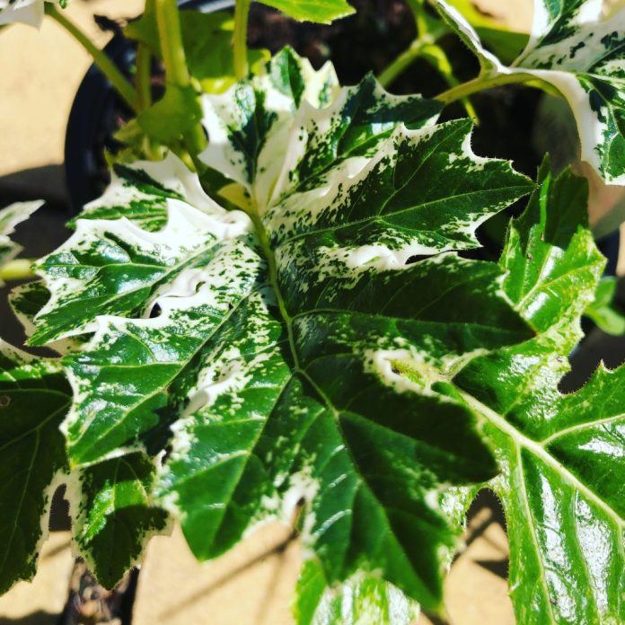 ‘Whitewater’ was bred to be bigger, bolder and more vigorous. The leaves are more deeply cut than those of ‘Tasmanian Angel’ and heavily marbled with white, giving the plant a brighter, more dramatic appearance even from a distance.